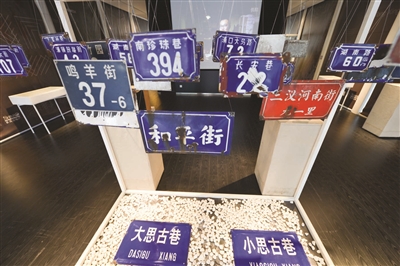 “老街坊、小弄堂,是属于那个年代白墙黑瓦的淡淡的忧伤……”老歌里唱着走街串巷的旧事记忆,而万俊把老街巷里废弃的门牌收集起来,用透明鱼线把50块南京老搪瓷门牌悬挂于展区一角,在灯光下集中展示南京市民的生活坐标,激发观众寻找记忆中的地名:“窑湾街33”、“鸣羊街37-6”、“大思古巷”、“小思古巷”……随着城市的变迁,这些熟悉的老街巷逐渐消失在人们的生活中。