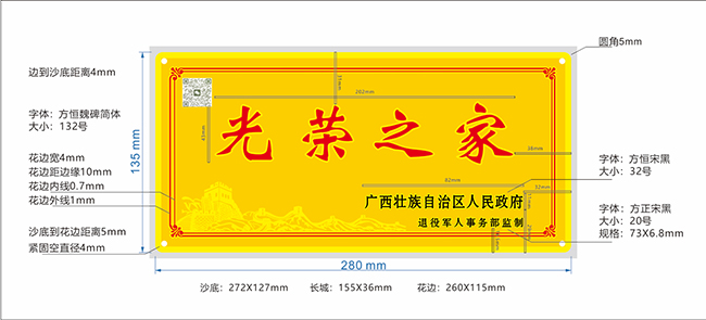 不锈钢标牌 光荣之家牌匾制作,光荣之家标牌采用不㺒材质,表面镀金印刷沙金文字高温烤漆工艺制作,厚度:1.0mm,尺寸:13.5cmX28cm,四角圆角处理。