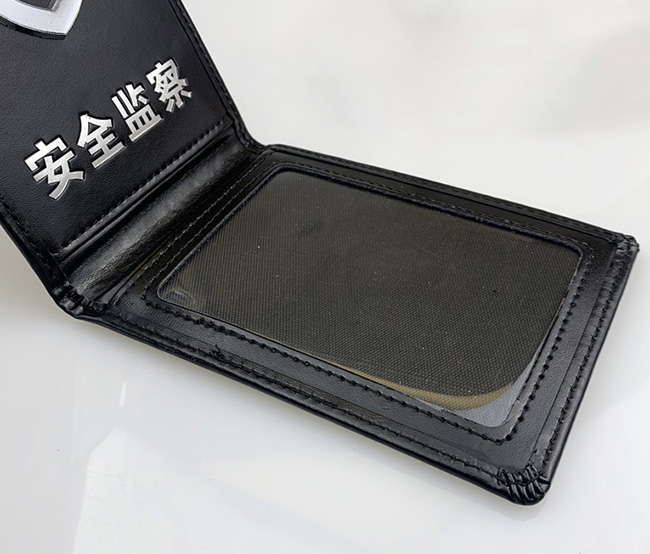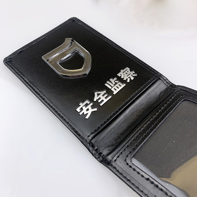 安全监察工作证皮套制作厂家 真皮卡套定制,皮夹材质采用黑色二层牛皮138纹,厚度>1.5mm,内衬360克绿钢板纸,安全监察工作证套整体高压定型,封面压印表面质感细腻,耐磨损。折叠后长宽为100*70mm,展开后长宽为205*70mm。皮夹四周及内侧插兜边缘均采用车线包缝工艺,中间带夹层,美观耐用。
