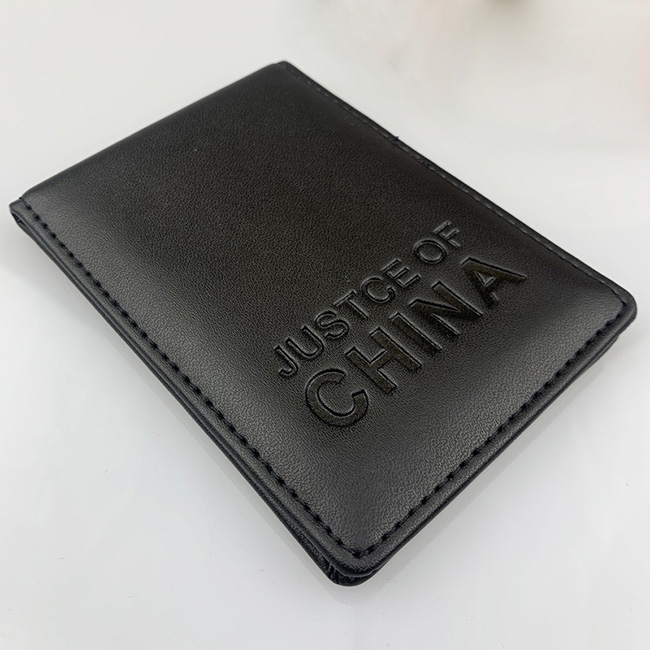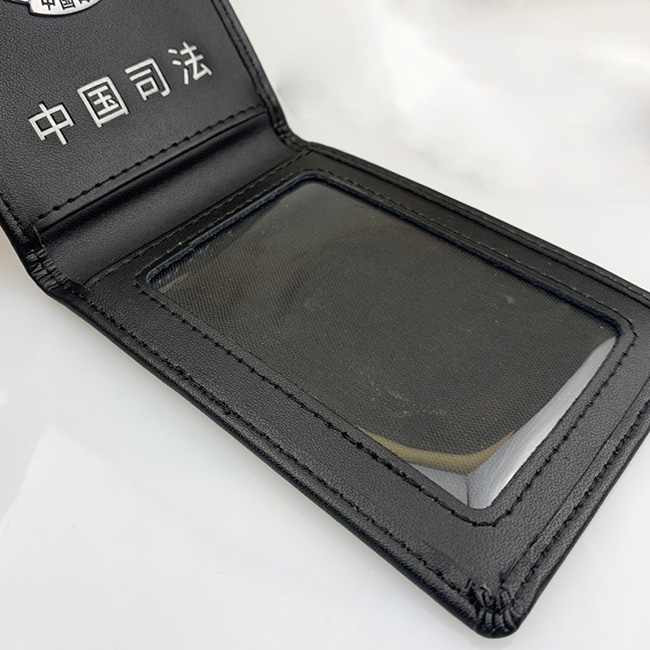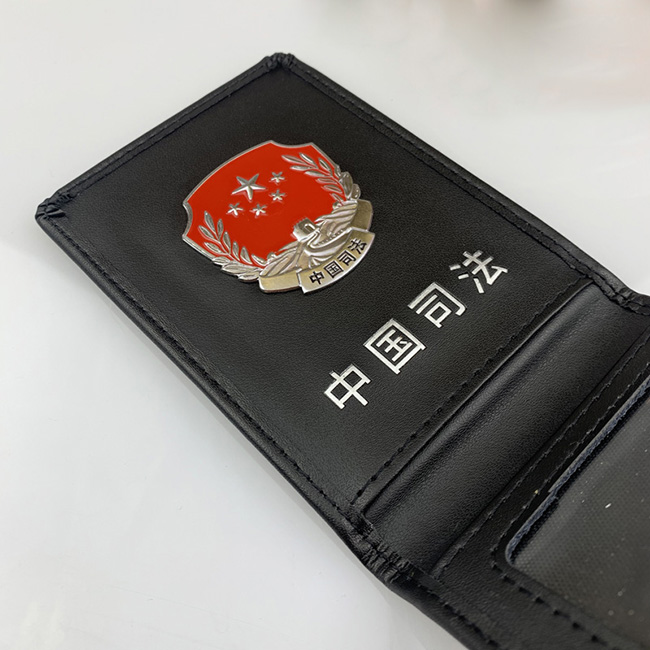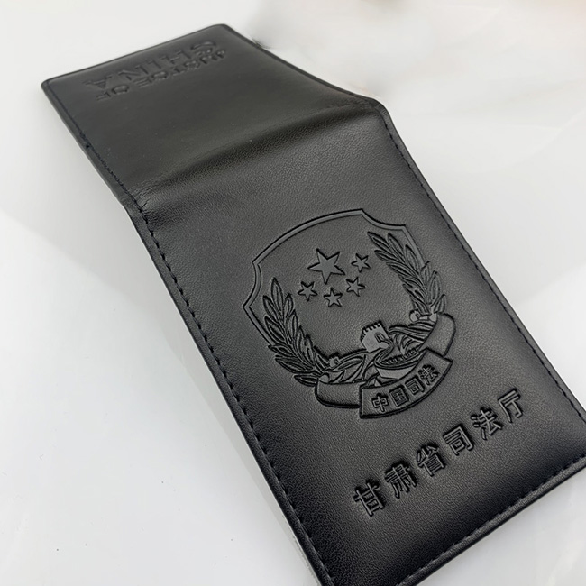 真皮工作证定做甘肃司法工作证皮套制作,我厂定制的甘肃省司法工作证皮套, 司法证件套采用上等牛皮制造,封面压痕司法机关的标识徽章,和甘肃省司法厅字样。皮套内部采用金属徽章订制,中国司法烫银工艺字样,透明卡位,执法时可清楚看到工作证信息。