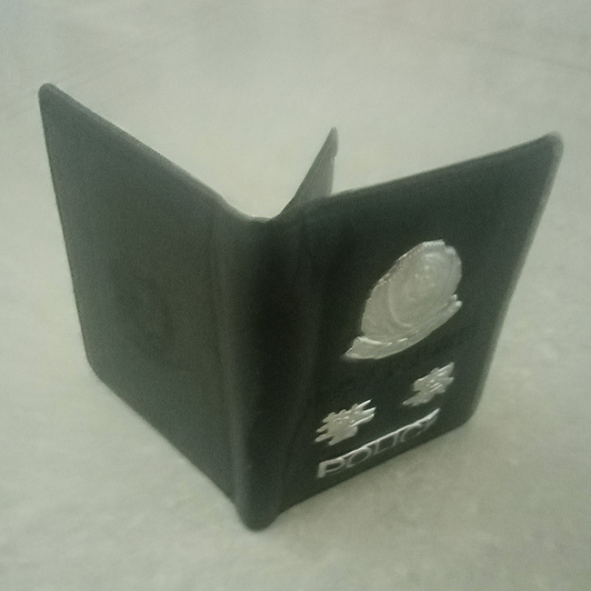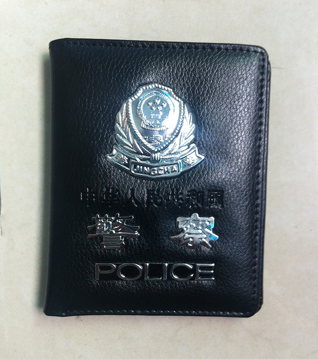 多层卡槽警察钱包皮套,尺寸:10cmX11.5cm,封面压痕加银色警徽,内有多卡位卡槽,皮套采用二层牛皮制作。