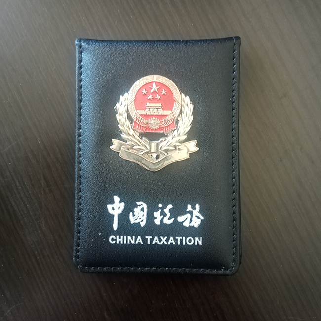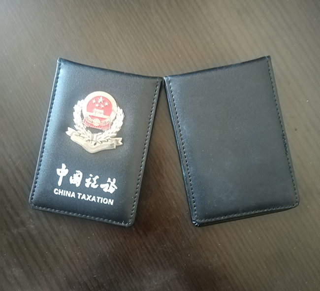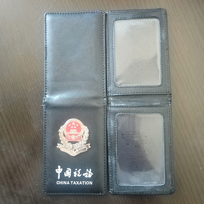 中国税务工作证皮套定做牛皮工作证卡套定制厂家,材质采用头层牛皮,税务工作证皮套合拢规格大小为102*72mm,封面中国税务采用烫银工艺和金属税务徽标,打开里面内放置证件的金仓卡位。