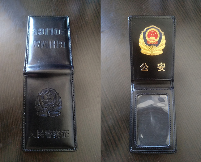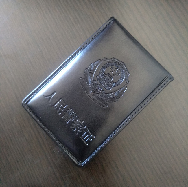 真皮工作证皮套厂家定做人民警察证,人民警察工作证尺寸:7cmX10cm,翻开尺寸:7cmX20.5cm,皮套采用头层牛皮制作,外部正面压印人民警察证和国徽标志,背面压印英文“CHINA POLICE"字样,翻开内部上端镶嵌金属警徽和公安字样,下端放置卡槽,卡位尺寸采用第二代居民身份证和名片大小制作。
