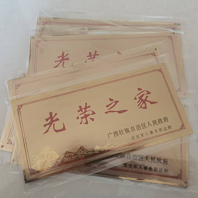 不锈钢标牌 光荣之家牌匾制作,光荣之家标牌采用不㺒材质,表面镀金印刷沙金文字高温烤漆工艺制作,厚度:1.0mm,尺寸:13.5cmX28cm,四角圆角处理。