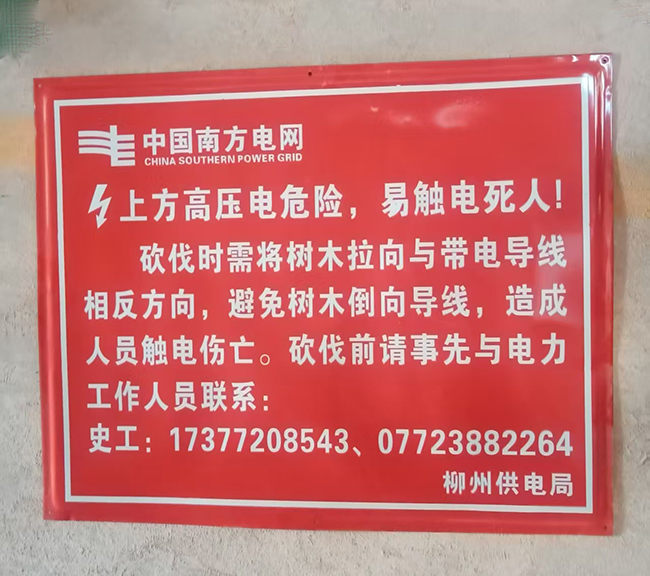 搪瓷标牌制作高压危险警示牌双面提示牌,中国南方电网高压警示牌采铁皮材质搪瓷工艺制作,尺寸:80cm*100cm,厚度:1.2mm,版面采用红底白字设计。